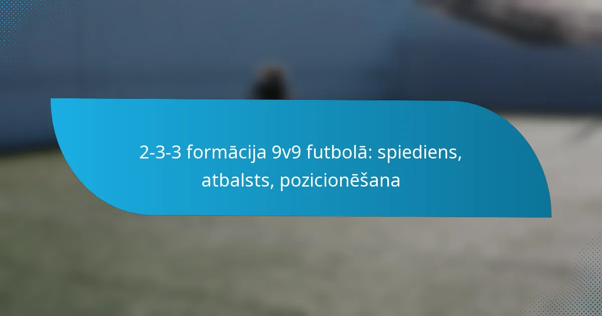 2-3-3 formācija 9v9 futbolā ir taktiska uzstādīšana, kurā ir divi aizsargi, trīs pussargi un trīs uzbrucēji, nodrošinot līdzsvaru starp uzbrukuma spēli un pussarga kontroli. Šī formācija uzsver koordinētu spiedienu uz bumbu nesošo spēlētāju un tūlītējas atbalsta sniegšanas nozīmi, lai atgūtu bumbu. Efektīva komandas sadarbība un stratēģiska pozicionēšana ir izšķiroša, ļaujot spēlētājiem saglabāt plūstošumu un kohēziju, izpildot gan uzbrukuma, gan aizsardzības stratēģijas.